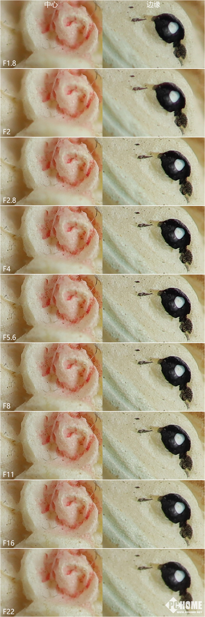 从各光圈下的分辨率表现来看,全开下的画质还是很不错的,而F4-F11之间是RF35mm F1.8 MACRO IS STM画质表现最好的光圈段,更难能可贵的是,边缘画质并不逊于中心画质,整体表现力都很好。