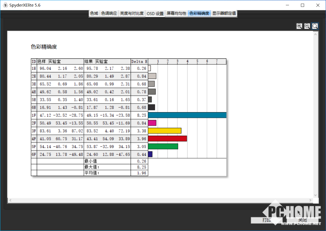 色彩准确度准表现方面,青色的最大色彩偏差达到了8.25,但其它颜色方面表现还不错,整体的平均ΔE为1.96。