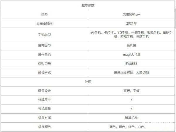 信息显示荣耀50 Pro+将会采用6.79英寸的AMOLED双打孔屏幕,支持HDR10+显示,屏幕指纹识别,还有120Hz的刷新率,搭载骁龙888处理器,标配8GB LPDDR5+128GB UFS 3.1的存储组合。配色拥有蓝色,绿色,红色,白色,黑色。
