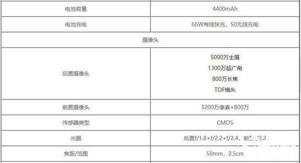 它的电池容量为4400毫安,支持66W有线+50W无线快充。前置3200万+800万双摄,后置5000万主摄+1300万超广角+800万长焦+ToF镜头。