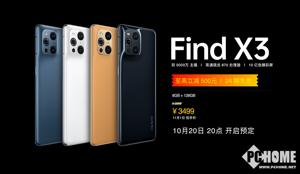 OPPO Find X3,双十一期间优惠500元,到手仅需3499元起;