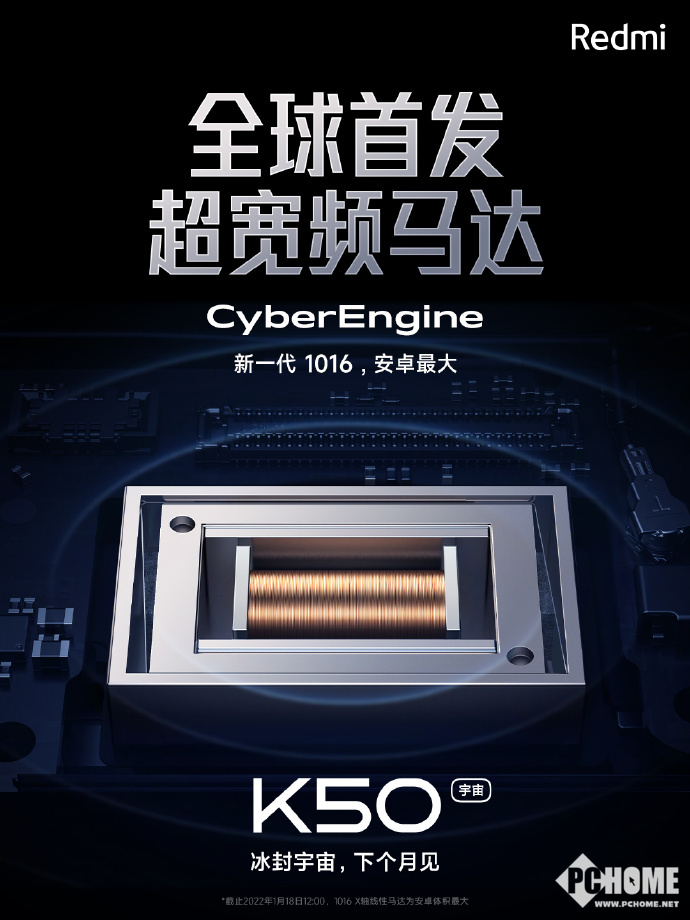 近日,红米Redmi手机官方发布公告称,Redmi K50宇宙将全球首发CyberEngine超宽频马达,代号1016。据Redmi介绍,CyberEngine超宽频马达可能是安卓史上最强X轴马达振感。
