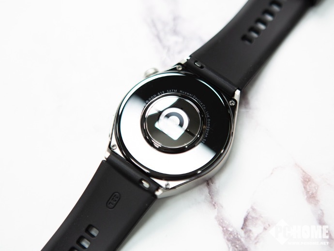 背部依旧是高强度的陶瓷后盖,中心位置采用了可以更好贴合手腕的心率镜片,通过精准的弧度突起与手腕骨骼完美贴合,同时略微突起的球型结构也有利于佩戴过程中的排汗,避免汗液累积对传感器识别产生影响。