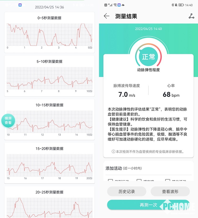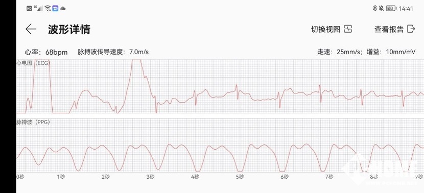 在测量完成之后也会在「运动健康」App中生成心电图/脉搏波动数据以及专业的评估建议。如果系统判定心脏或动脉存在健康风险,就会提供专业就医建议。