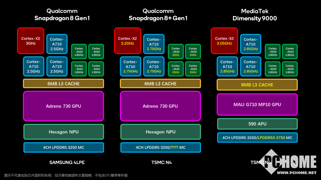 全新高通骁龙8+ Gen1采用台积电4nm(N4)制程,保持基本架构不变的情况下,提升Cortex-X2超大核至3.2GHz,Cortex-A710中核从2.5GHz提升到了2.75GHz,Cortex-A510中核至2GHz。
