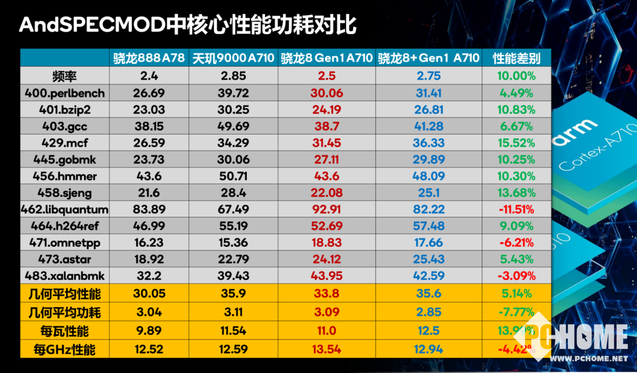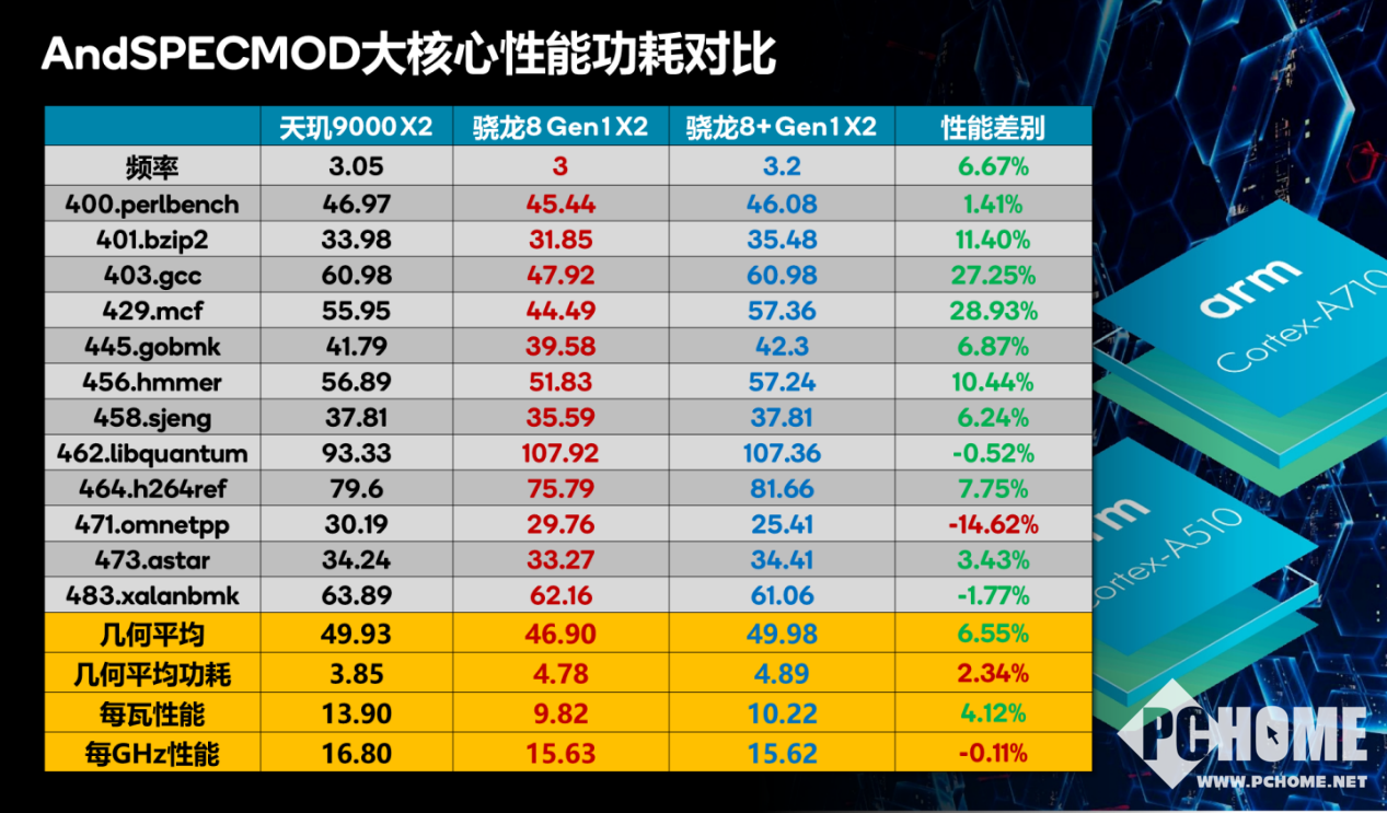 其评测结论为:“骁龙8+ Gen 1的Cortex-A710从2.5提升到了2.75GHz,性能提升了5.14%,但功耗还下降了7.77%,能效比综合提升了14.55%,台积电的N4工艺优势还是很明显;而对比的天玑9000提升到2.85GHz的功耗却高达3.7W,相距Cortex-X2 3.85W都不太远,频率逐渐远离甜点,追求过高频率付出高昂代价;”