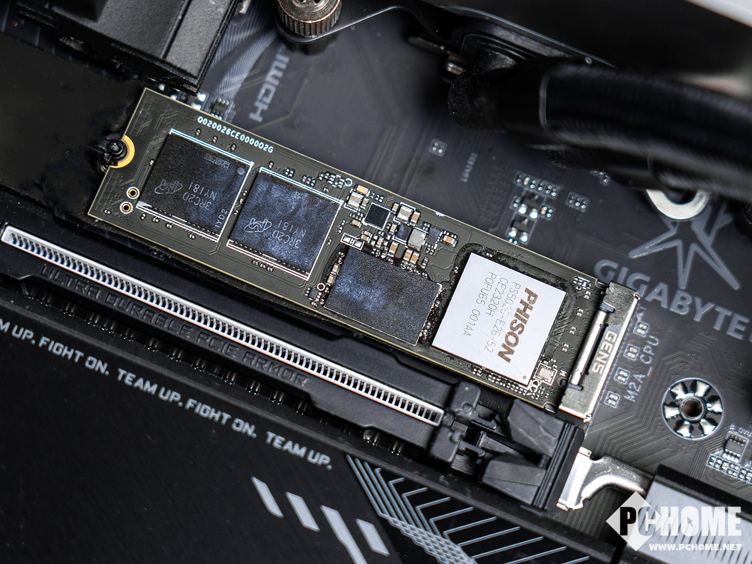 该主板还拥有PCIe 5.0 M.2插槽,带来更快的硬盘读写速度。我们选择了同样来自于技嘉大雕512K AORUS Gen5 12000 SSD 2TB版,无论是速度还是容量都能够充分兼顾。