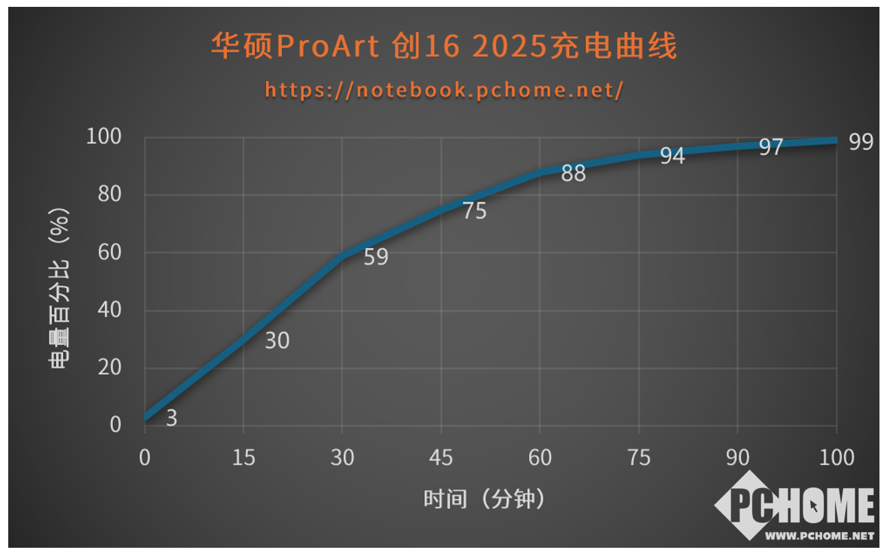 充电方面,ProArt 创16 2025标配200W充电器,充电实测显示前半个小时即可充至59%的电量,60分钟可充至88%,随后进入涓流充电过程,充至99%用时100分钟,整体充电速度令人满意。