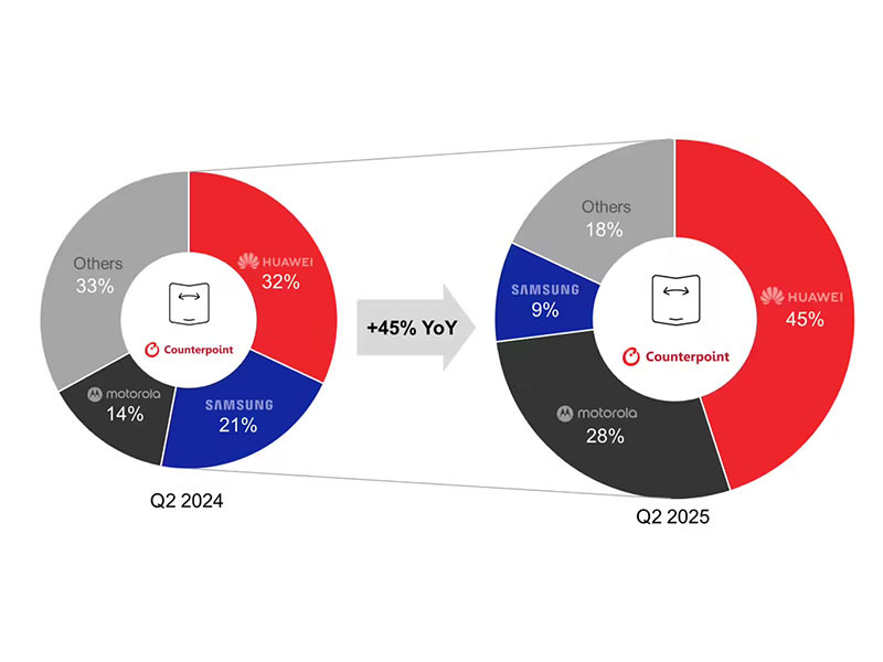 华为和摩托罗拉是市场增长的主要驱动力,华为在该季度获得了45%的市场份额,相比2024年同期的32%市场份额,实现了40.6%的大幅度增长,稳固了华为折叠屏市场第一市场地位。