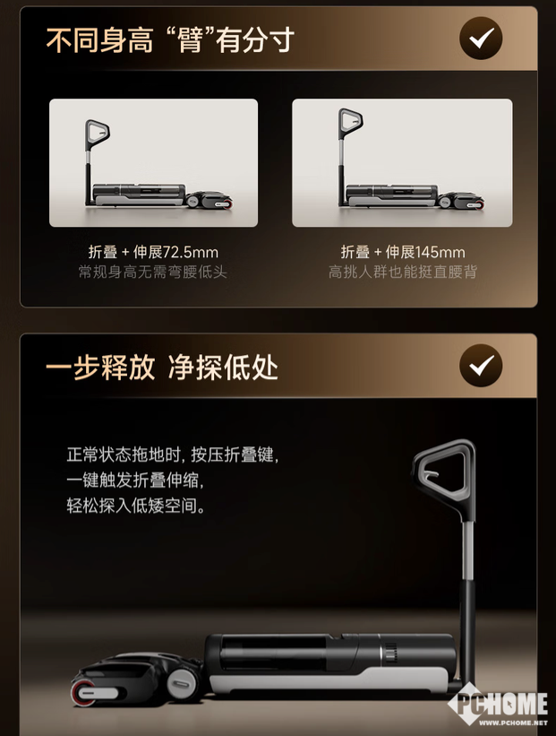 相比之下,行业内的折叠设计大多只能伸展100mm左右,操作僵硬、体验有限,无法真正解决“免弯腰”的痛点。而追觅折叠平躺洗地机T40 Fold的设计则更加友好,不论是高个子还是常规身高,都能直腰完成清扫。