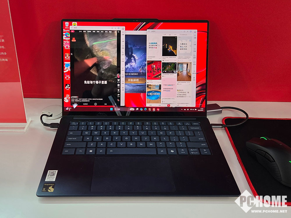 首先就是在日常使用中,很多人都会认为骁龙PC平台的应用数量不够,但骁龙方面则将思路打开,通过移动平台的丰富应用,一举打破了应用数量的困境。骁龙PC平台已经与腾讯应用宝达成合作,能够将移动端应用无缝迁移到PC端,简而言之就是可以在骁龙PC的Windows 11系统中,直接安装AKP应用。在应用丰富起来后,即可发挥PC的大屏和多任务优势,演示中就同时开启了视频应用、社交应用外加一个游戏,这在手机中是基本不可能实现的。