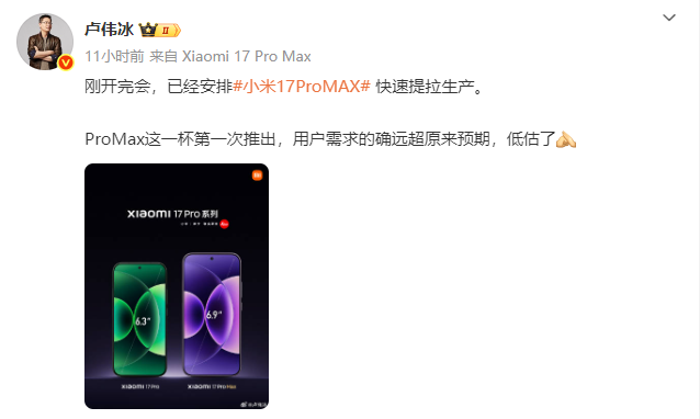 据小米卢伟冰透露,小米17 Pro Max的用户需求远超原来预期,出乎意料的受欢迎,单款机型也打破了今年国产手机全价位段首销全天销量、销售额纪录,在小米17系列中销量占比超过 50%。随之表示已经决定快速提拉生产,来解决缺货难题。