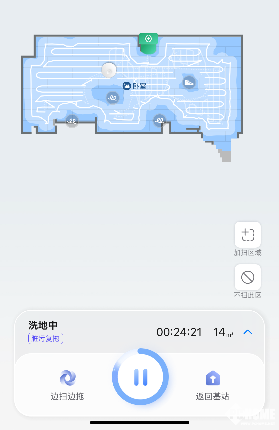 此外,石头P20活水版扫地机在清洁时,识别到哪一块的地面比较脏的时候,就会自动对这片区域进行脏污复拖,保证地面的洁净度。