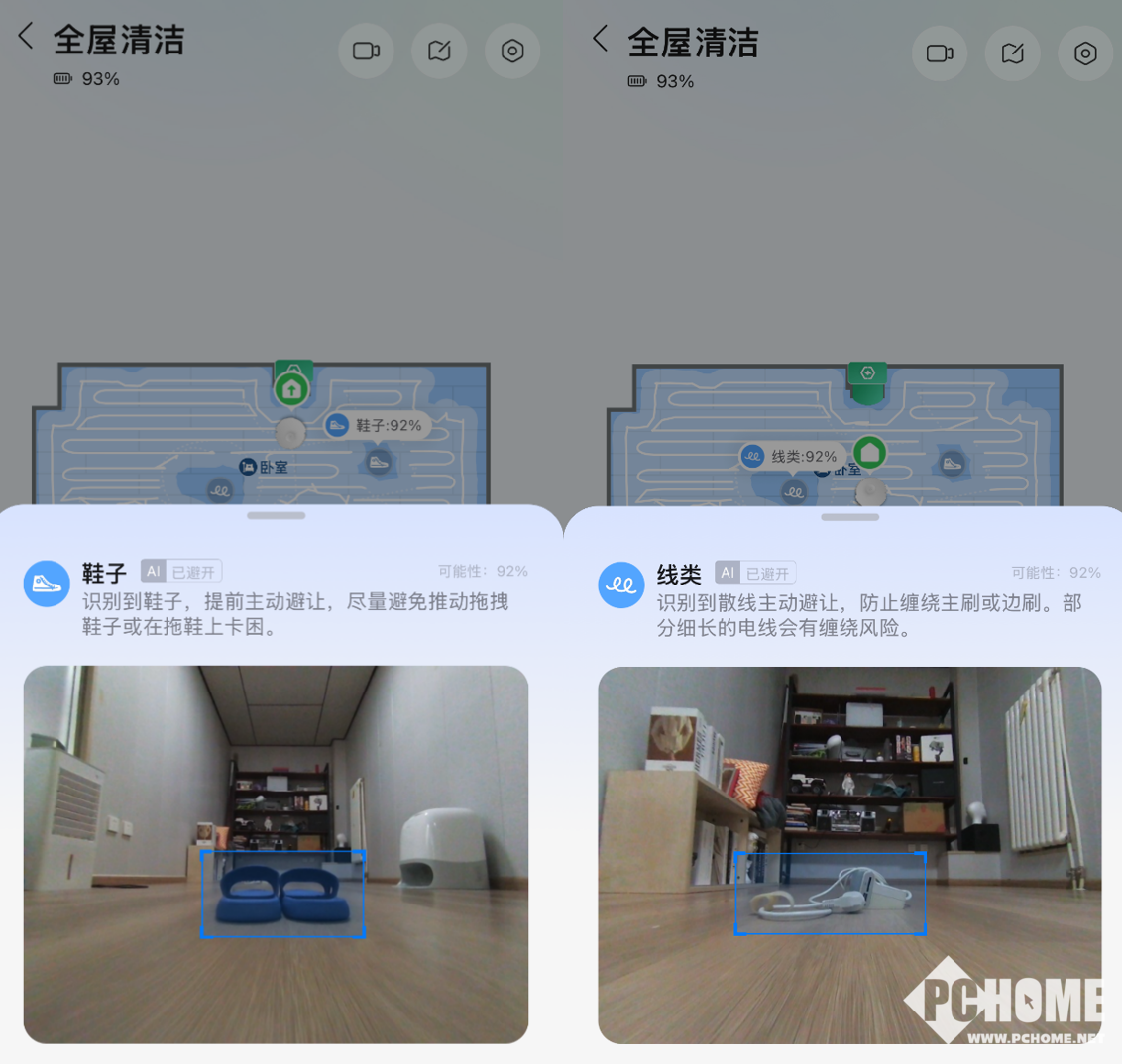 石头P20活水版支持结构光测距+RGB识别+沿边激光三重避障保障,拥有毫米级精准测距,RGB摄像头可识别超200种物体类型,识别出来的障碍物能在建好的地图中标注并且拍下照片。插线板、拖鞋、线材都识别的非常精准。