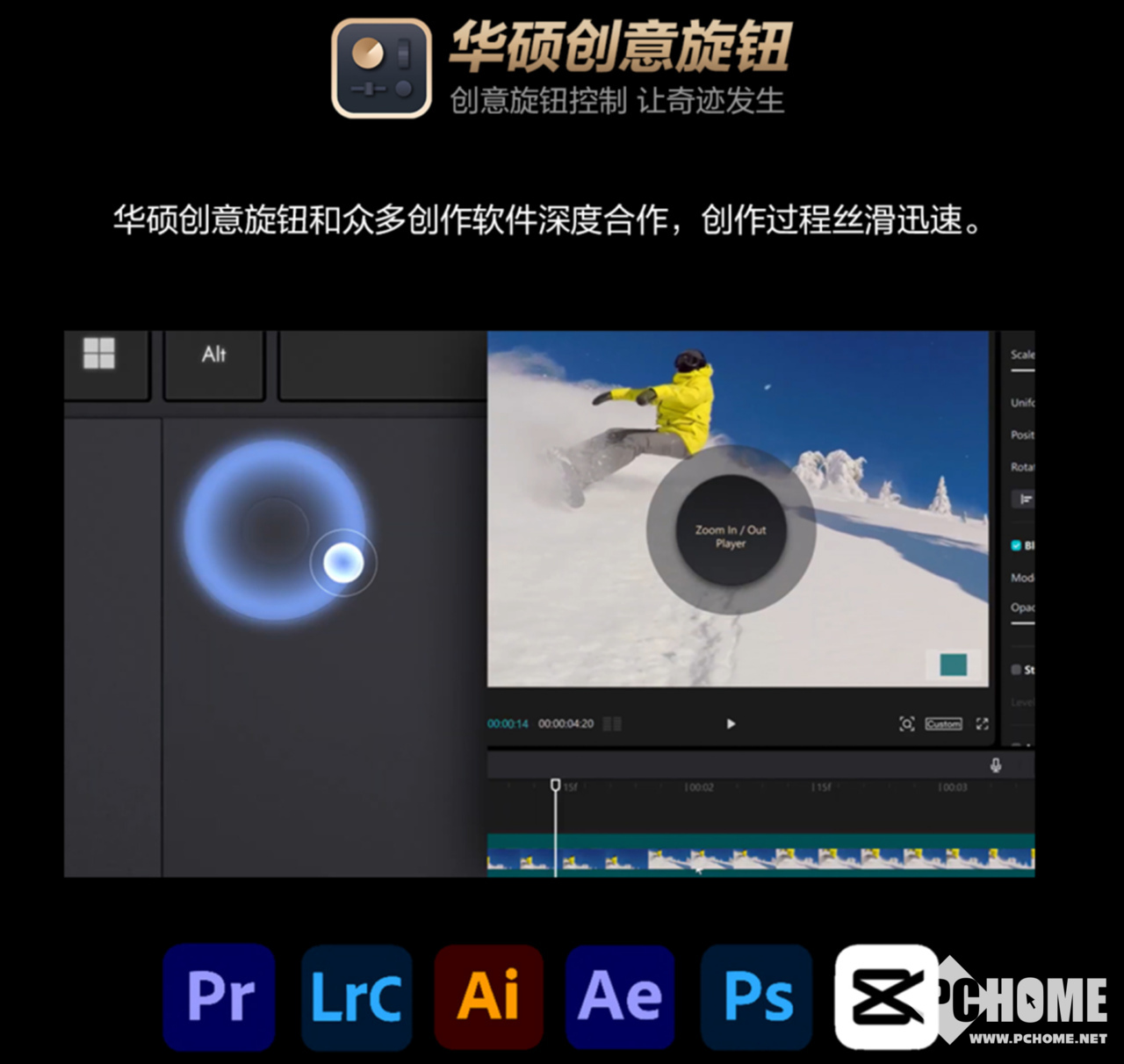 凭借华硕创意按钮,用户在Photoshop中能快速调整笔刷大小与流量;在Premiere中能顺畅控制时间轴缩放;在After Effects中则能灵活定位关键帧。相比传统鼠标操作,创意旋钮让效率大幅提升,真正做到“所想即所得”。