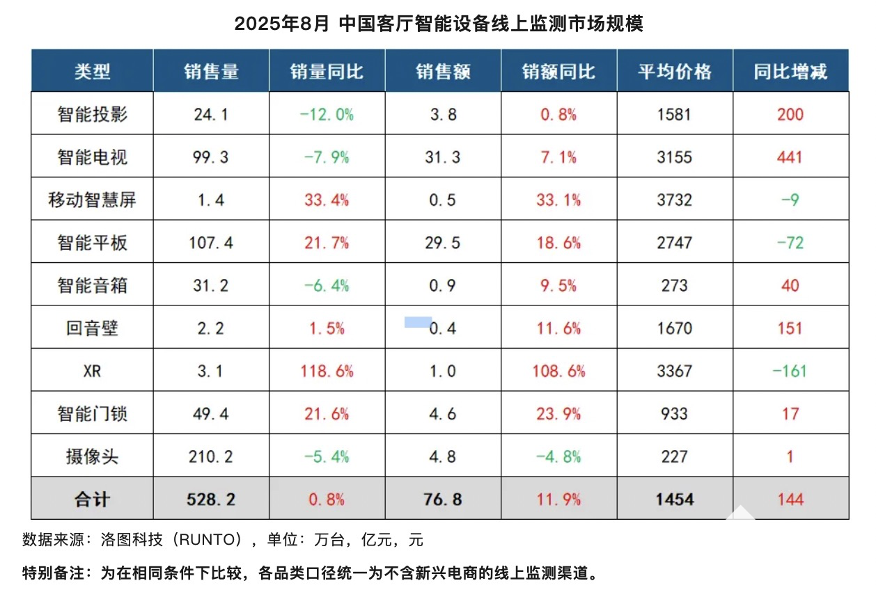 10月1号消息,根据洛图科技最新线上监测数据显示,2025年8月,中国客厅智能设备的线上监测市场(不含拼抖快等新兴电商)总零售量为528.2万台,同比上涨0.8%;总零售额达76.8亿元,同比上涨11.9%。