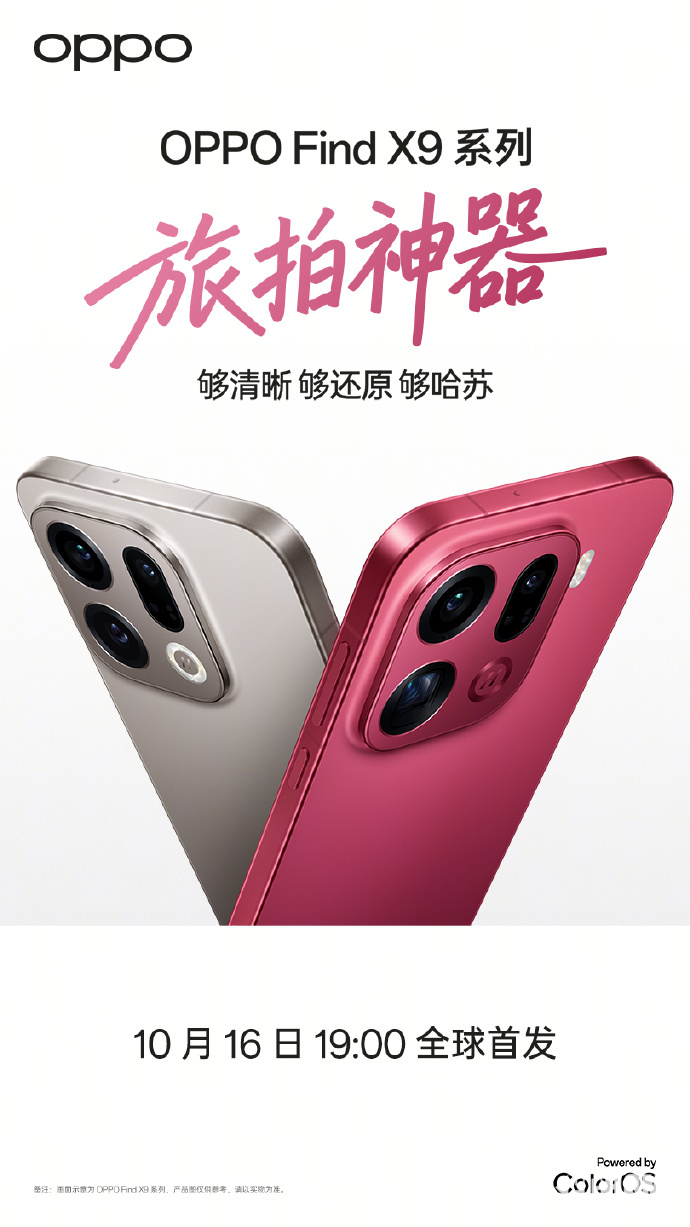 OPPO官方宣布,OPPO Find X9系列 将在10月16日19:00全球首发,够清晰,够还原,够哈苏,是哈苏画质王,更是新一代「旅拍神器」。从此,出游不用背相机。