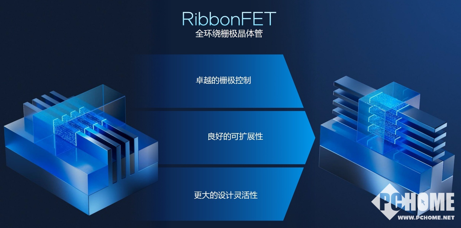 RibbonFET晶体管采用新的全环绕栅极(GAA)结构(台积电和三星的2纳米节点也使用了GAA),缩小了芯片组件,另外栅极布置方式由垂直改为水平堆叠的四层纳米片,实现卓越的全包围栅极控制,降低了短沟道效应(电流泄漏),提升晶体管开关效率,同时拥有更灵活的设计和扩展性。