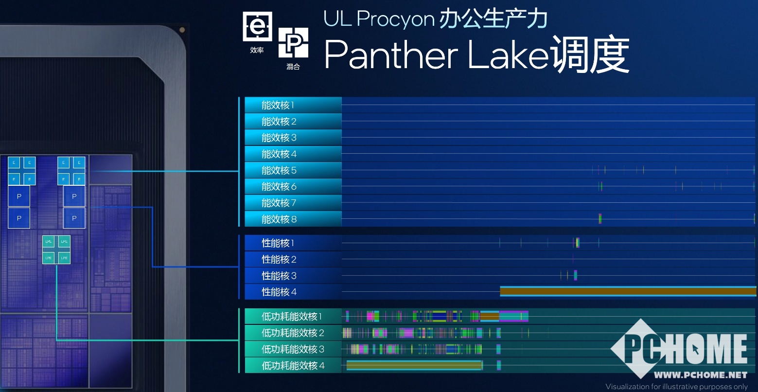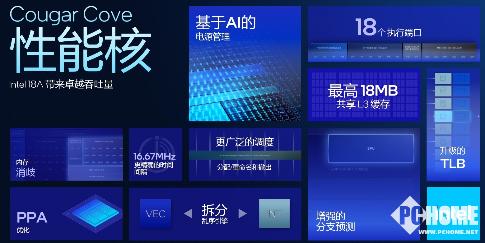 此次Panther Lake采用了P+E+LPE的三种核心组合,其中全新P核心代号Cougar Cove,拥有18MB共享L3缓存,支持TLB增强功能,适用现代工作负载,分支预测、内存歧义消除带来更可靠更高效的性能表现。