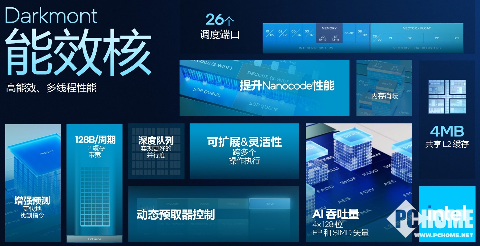 全新E核和LE核均采用Darkmont架构,只是二者在三级缓存和频率设定方面存在不同。Darkmont带来了增强的预测能力、L2缓存带宽的显著提升,以及更强的可扩展性、灵活性和AI性能。