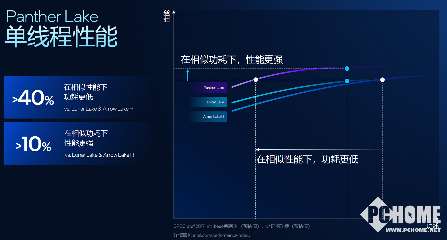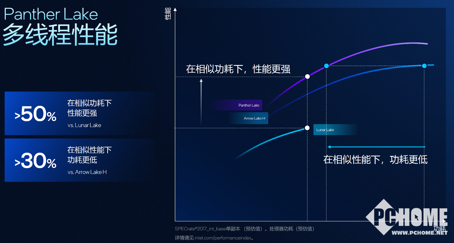 与Lunar Lake相比,在相同功耗下,Panther Lake单线程性能提高10%,多线程性能提升更是超过50%,而在同样的多线程性能下相比Arrow Lake-H功耗又降低了30%。