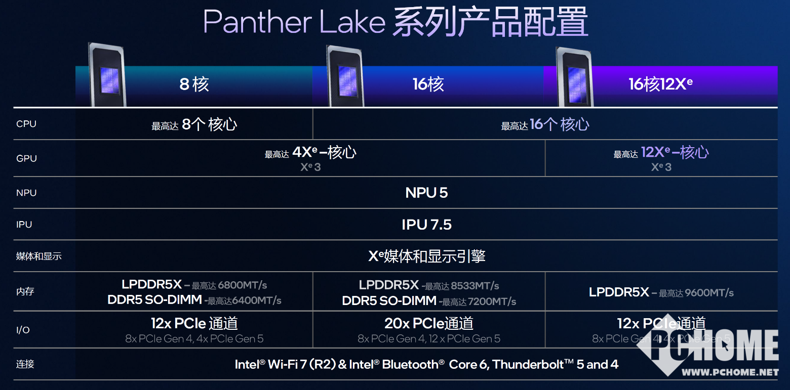 目前公布了三种架构组合,分别是8核、16核、以及16核+12核Xe3 GPU的配置,从参数上来看,其实我们已经能大概看出搭载这三款配置的笔记本产品。