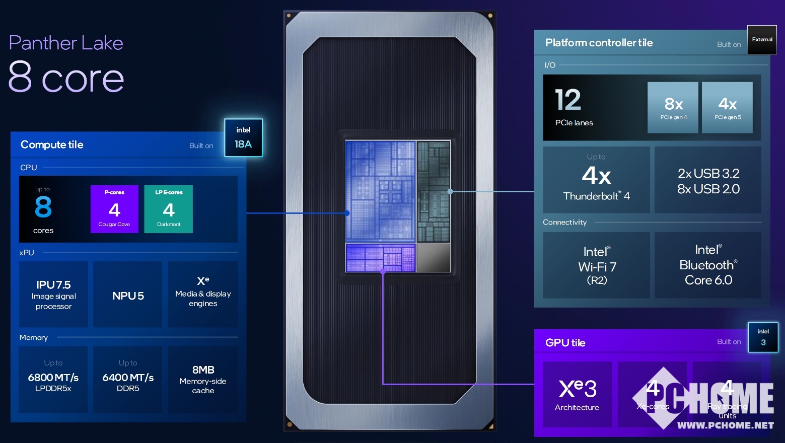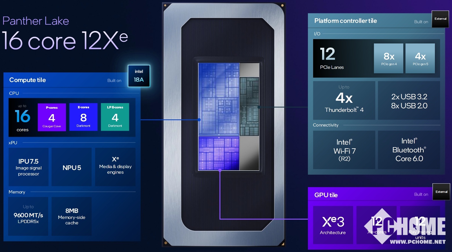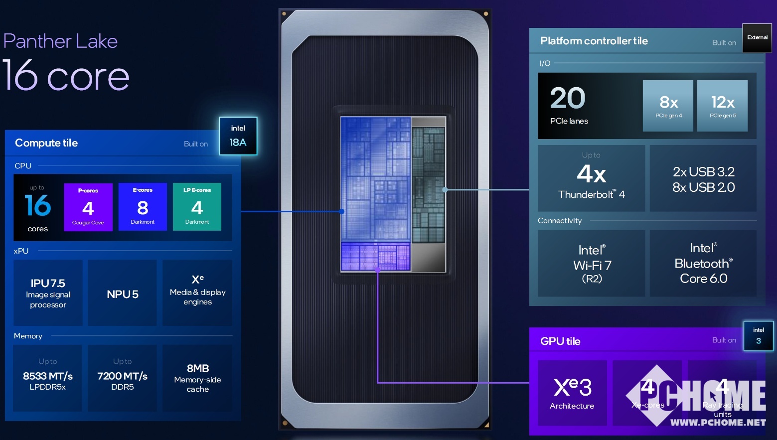 16核心版本是为高性能产品,以及需要连接独立显卡的机型准备,因为这个版本的PCIe通道达到了20条。由4颗P核和8颗E核心以及4颗LPE核心组成,同样配备4颗Xe3 GPU核心;