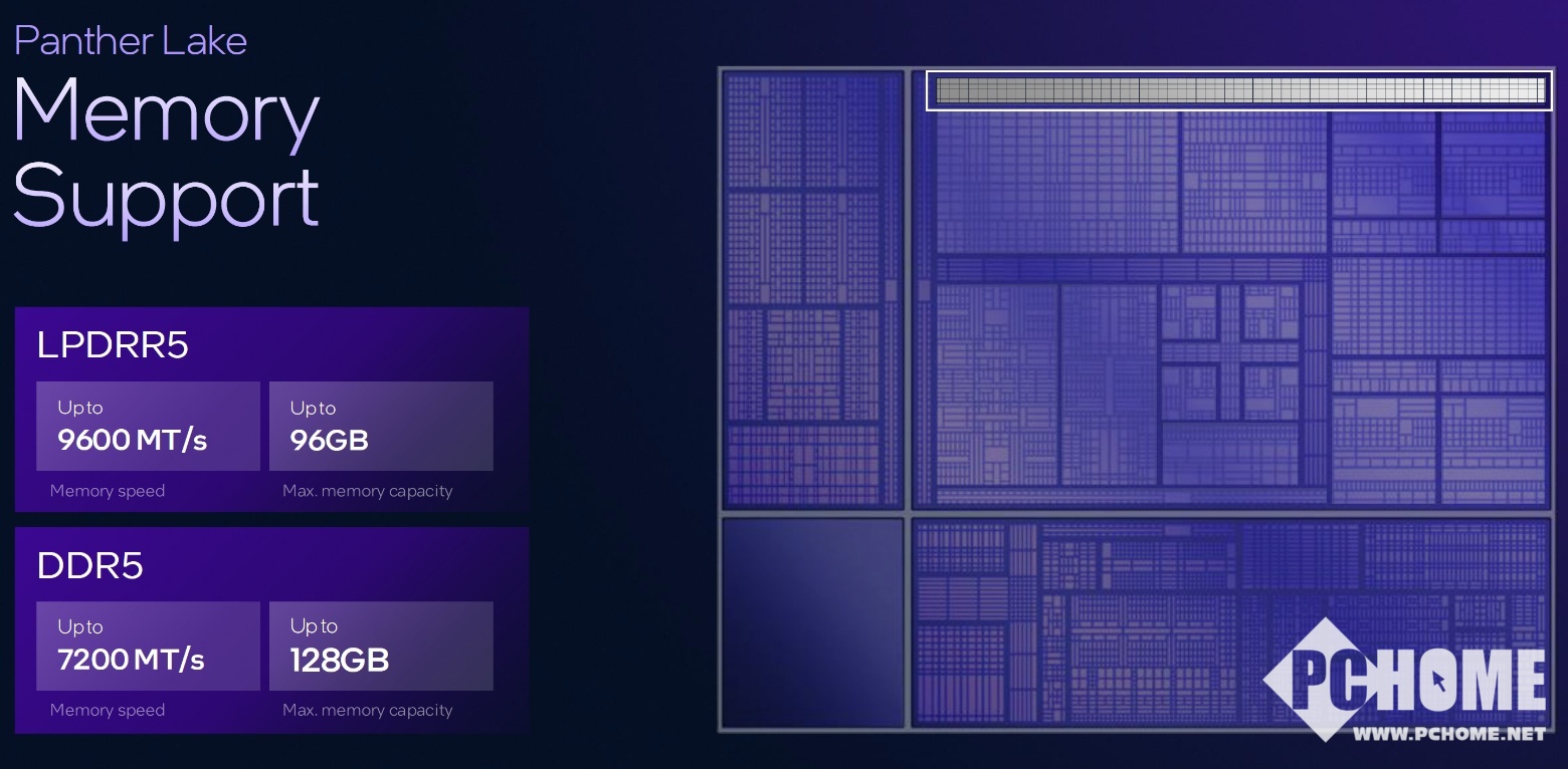 内存支持方面,Panther Lake新加入了LPCAMM2支持,作为下一代的内存标准,这种内存集灵活性和扩展性于一身。同时LPDDR5X板载内存的频率上限也提升到了9600 MT/s。