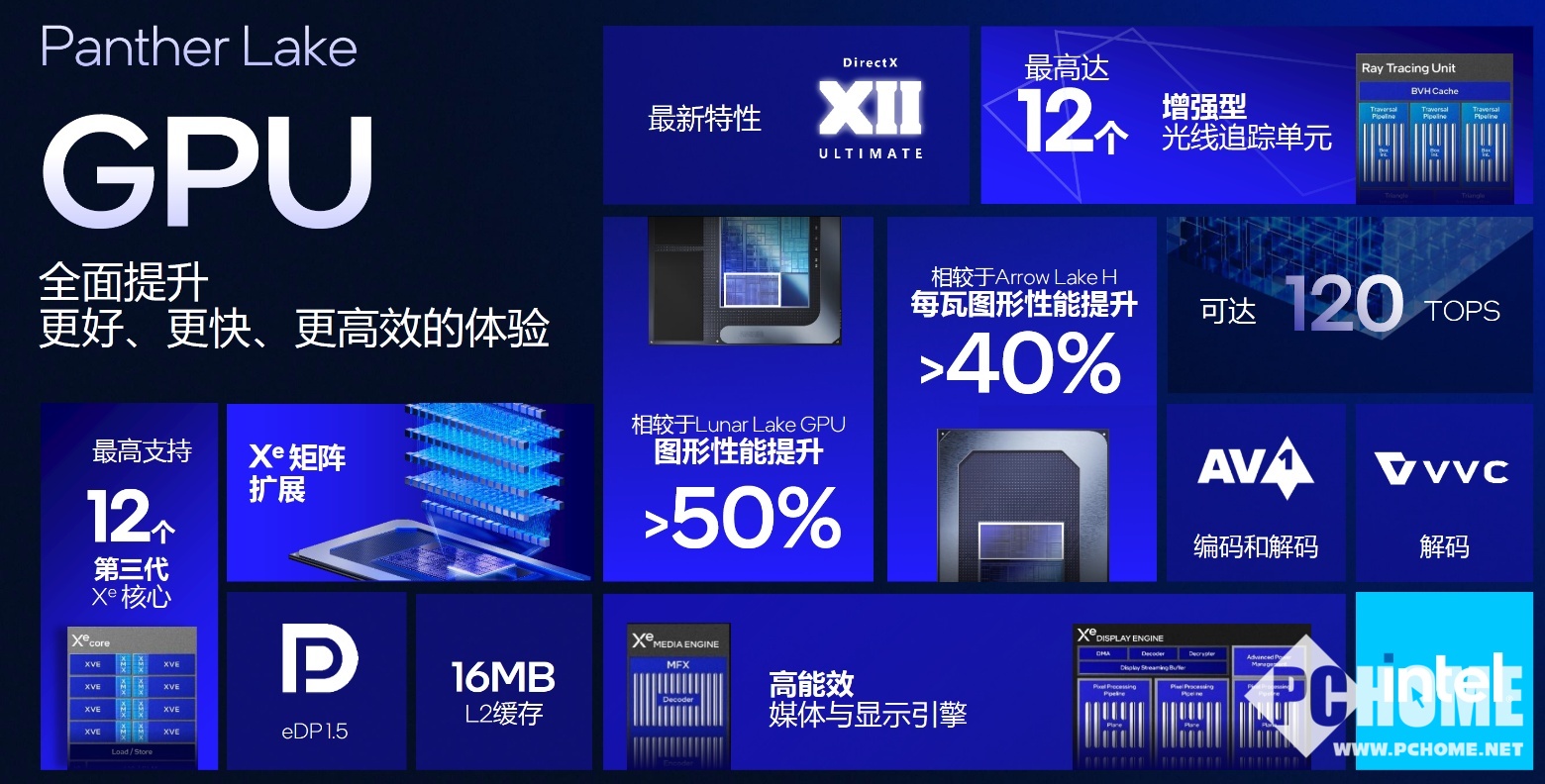 Panther Lake上变化最大的Tile还有GPU,作为第三代Xe架构,全新设计的Xe3 Core在性能上进行了深度优化,包括第三代Xe核心、增强光追单元、提升XVE矢量引擎利用率等。每瓦性能大幅提升,最高多达12个Xe核心,算力达到120 TOPS。