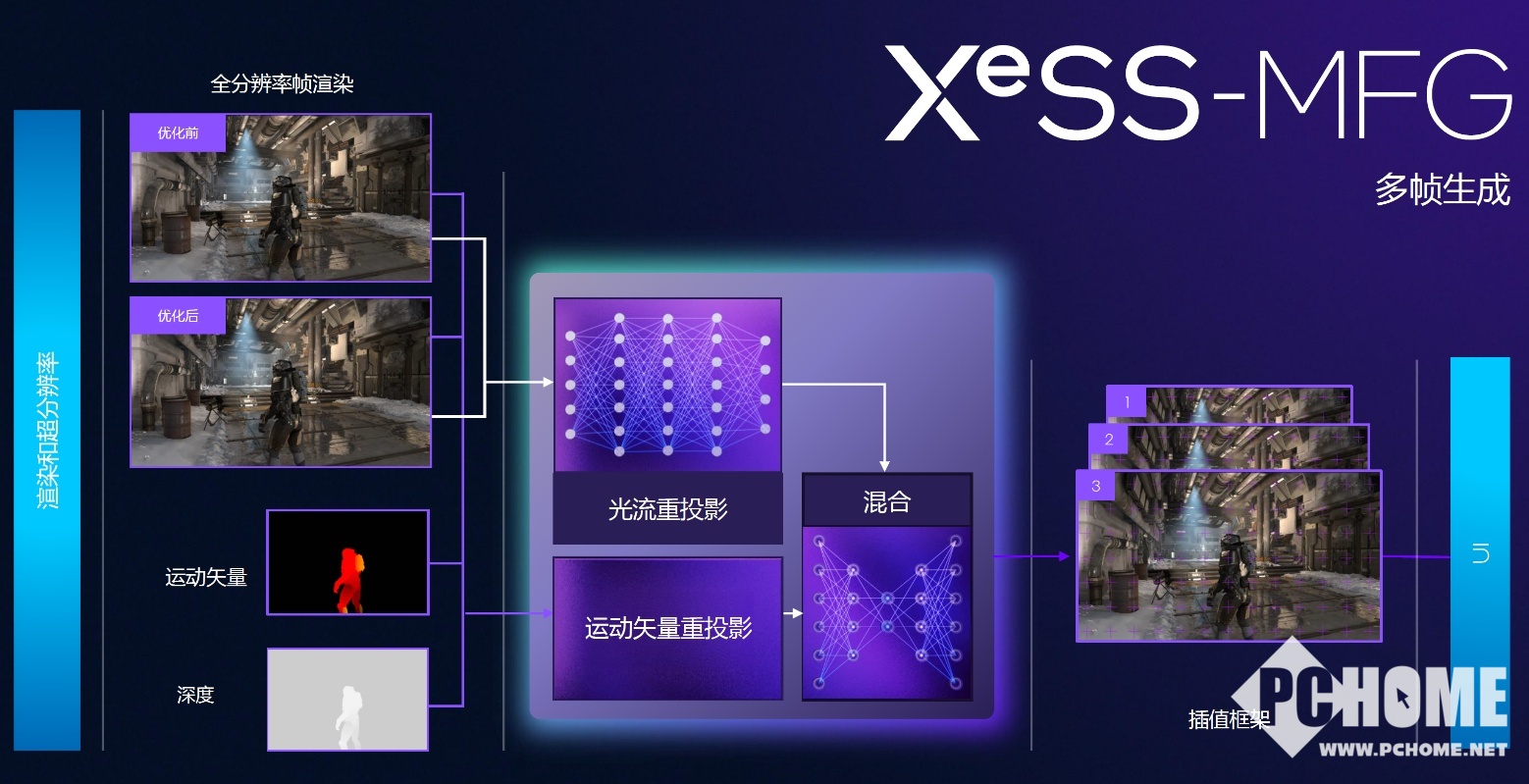 大家最关心的多帧生成(MFG)与NVIDIA DLSS 4类似,也是通过提取已有帧画面中的运动矢量、深度信息,利用XMX引擎的AI处理能力,结合光流、运动矢量信息进行混合重建,生成新的帧画面,这将大幅提升游戏中的帧率表现。