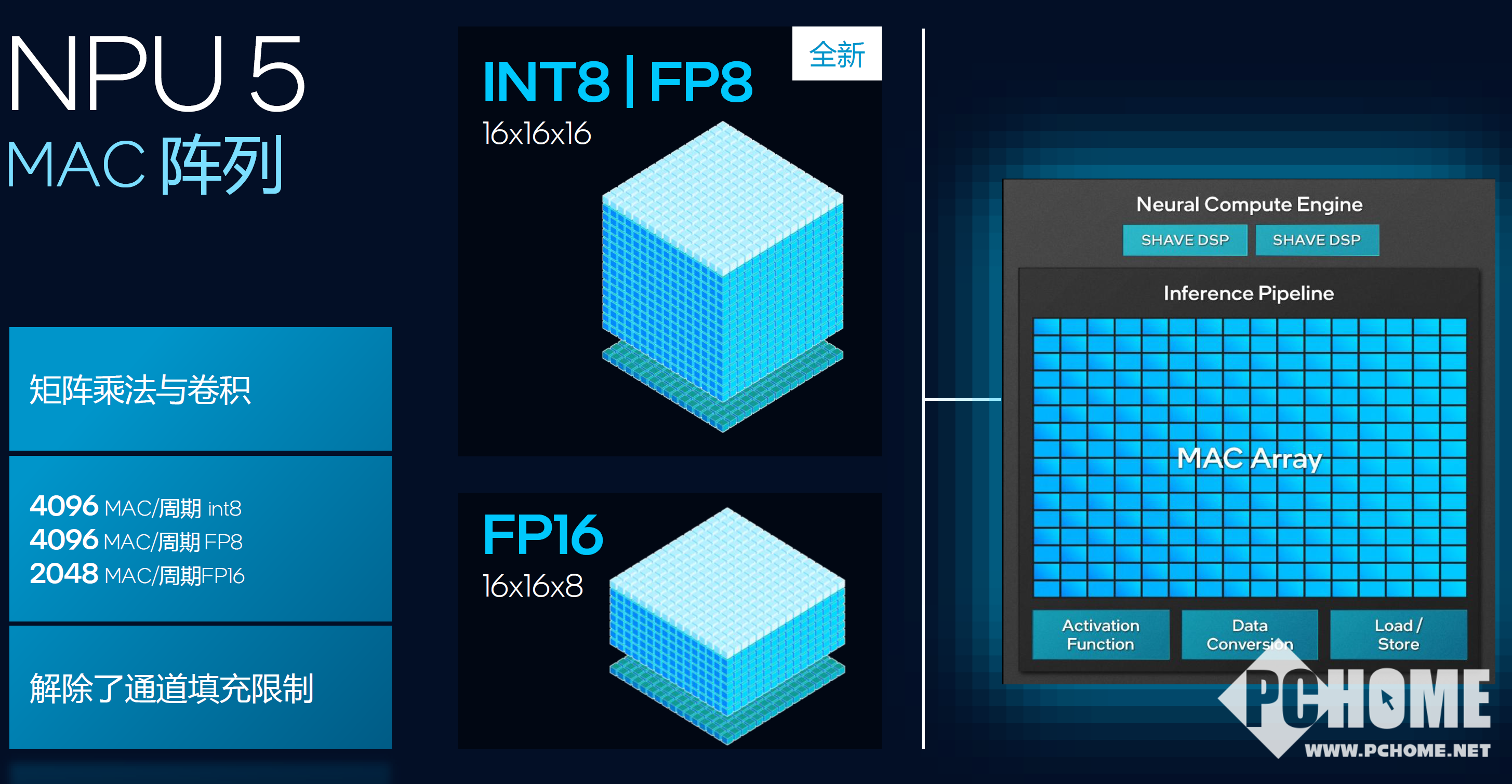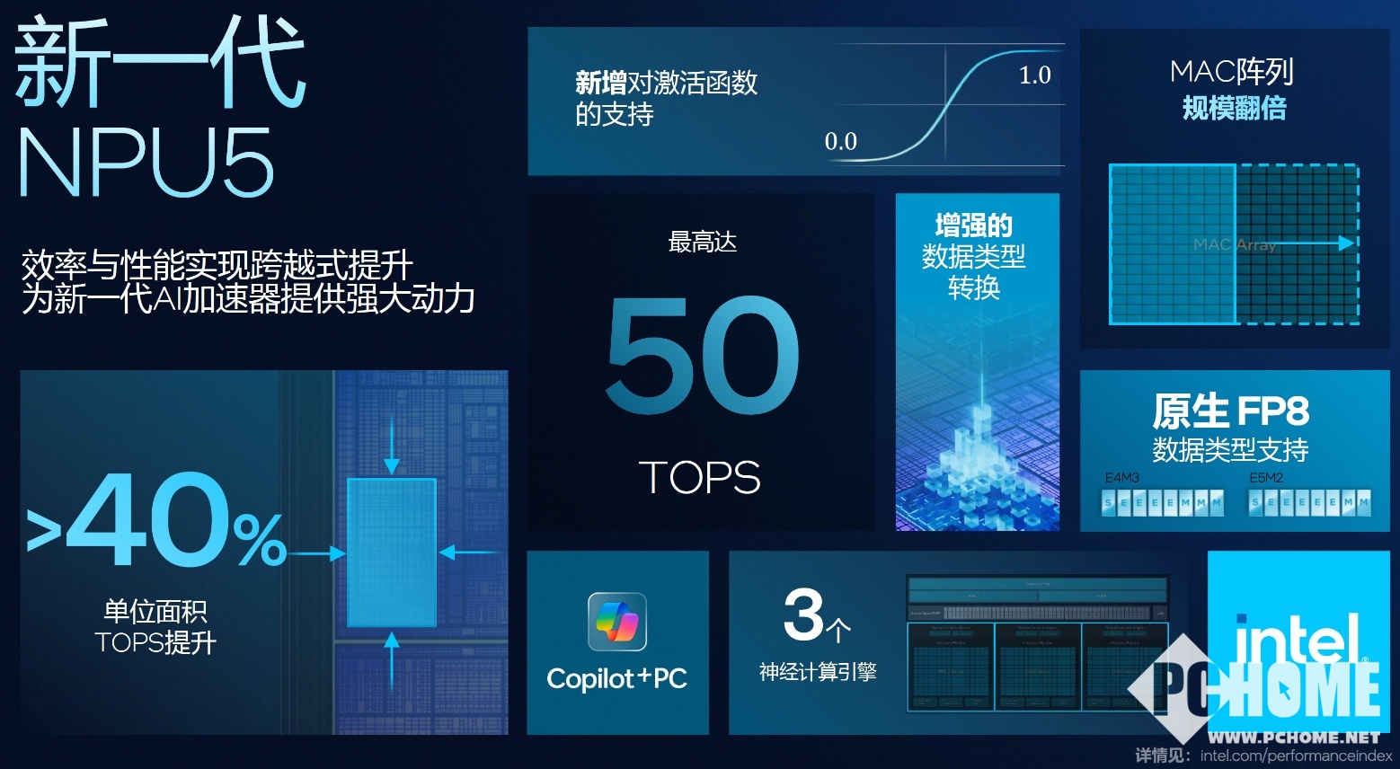 作为新一代AIPC,当然不能没有NPU。Panther Lake中新的NPU 5算力达到50TOPS,可能与Lunar Lake集成的NPU 4(48TOPS)相比绝对数值变化不大,但同等面积下的算力提高了40%,也就是芯片总面积缩小了,同时降低了功耗,并加入了原生的FP8数据类型支持。