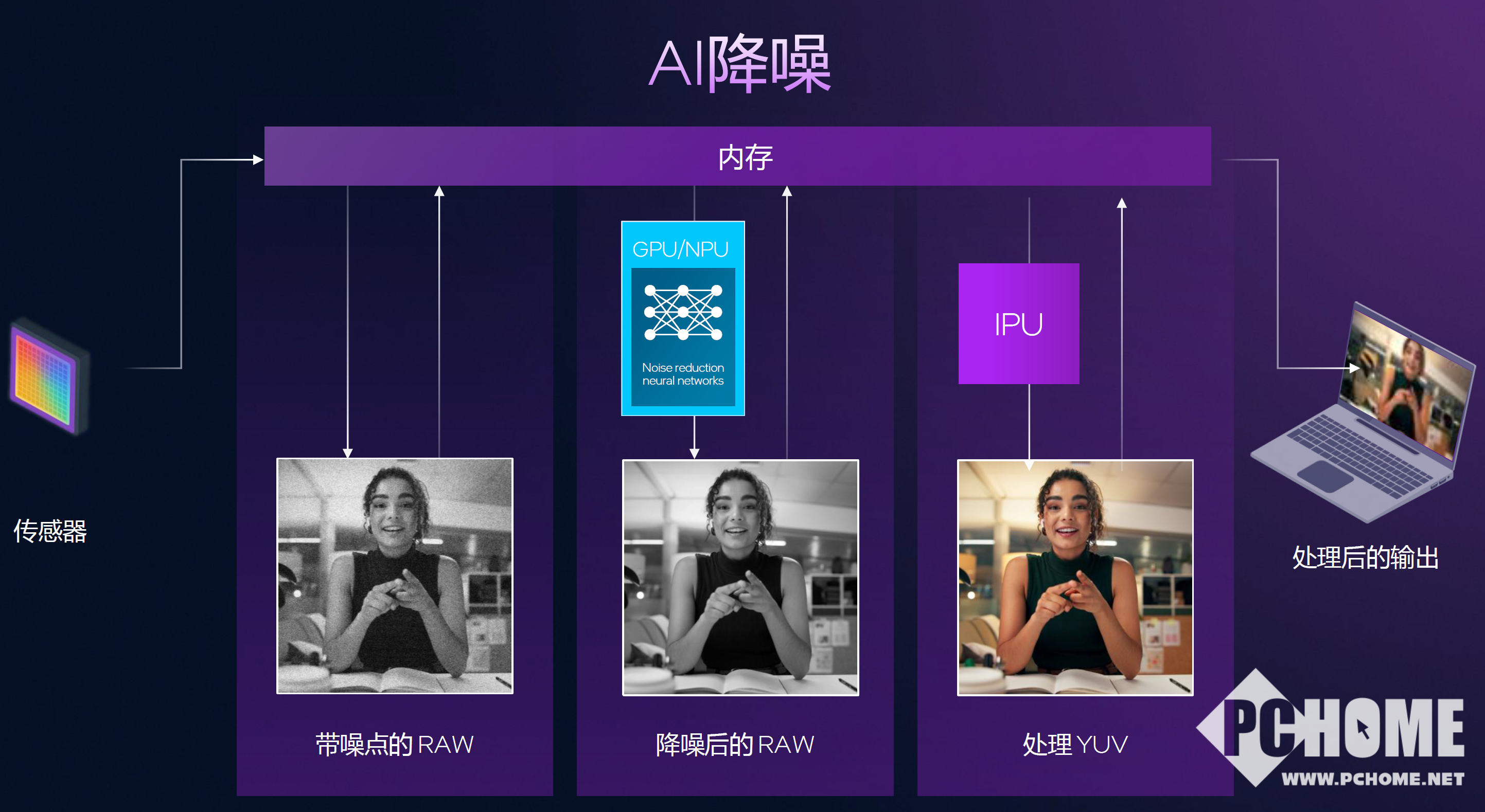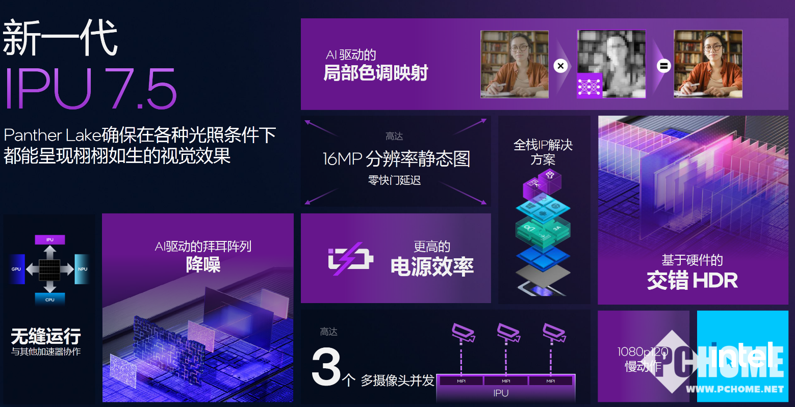 值得关注的还有IPU,下一代的7.5版本IPU,内置了ISP 101,相比使用摄像头内置输出,这种硬件级优化将大大提升笔记本前置摄像头的画质表现,还可以支持AI降噪、HDR视频等功能,而这一切是在极低功耗下实现的。
