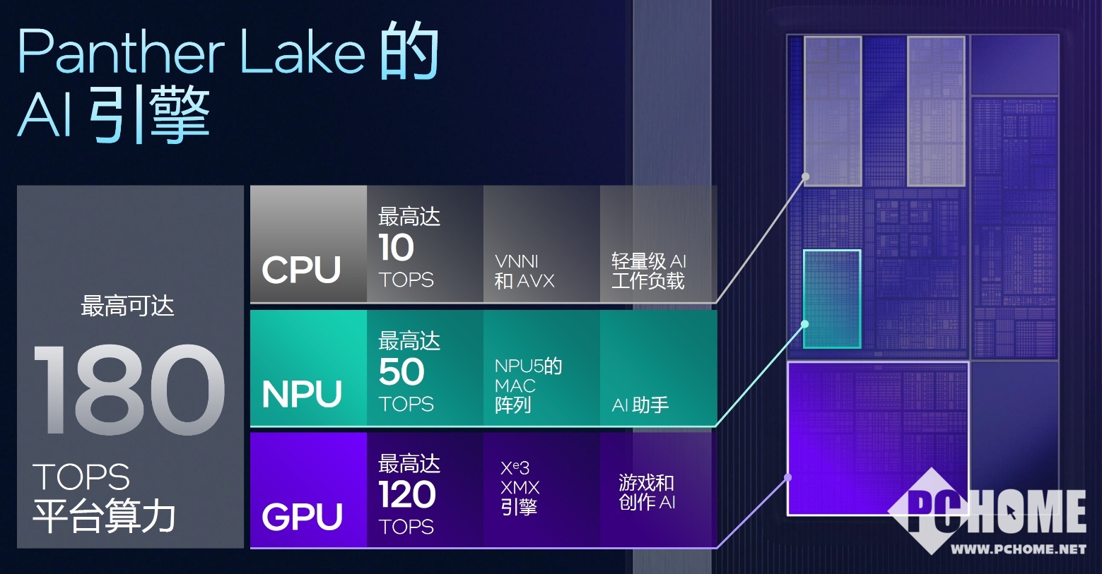 Panther Lake的综合算力最高达到180 TOPS,其中CPU适用于轻量化的AI负载,NPU则适合AI助手之类常驻后台且要求低功耗的应用,而GPU则适合游戏和内容创作类负载。