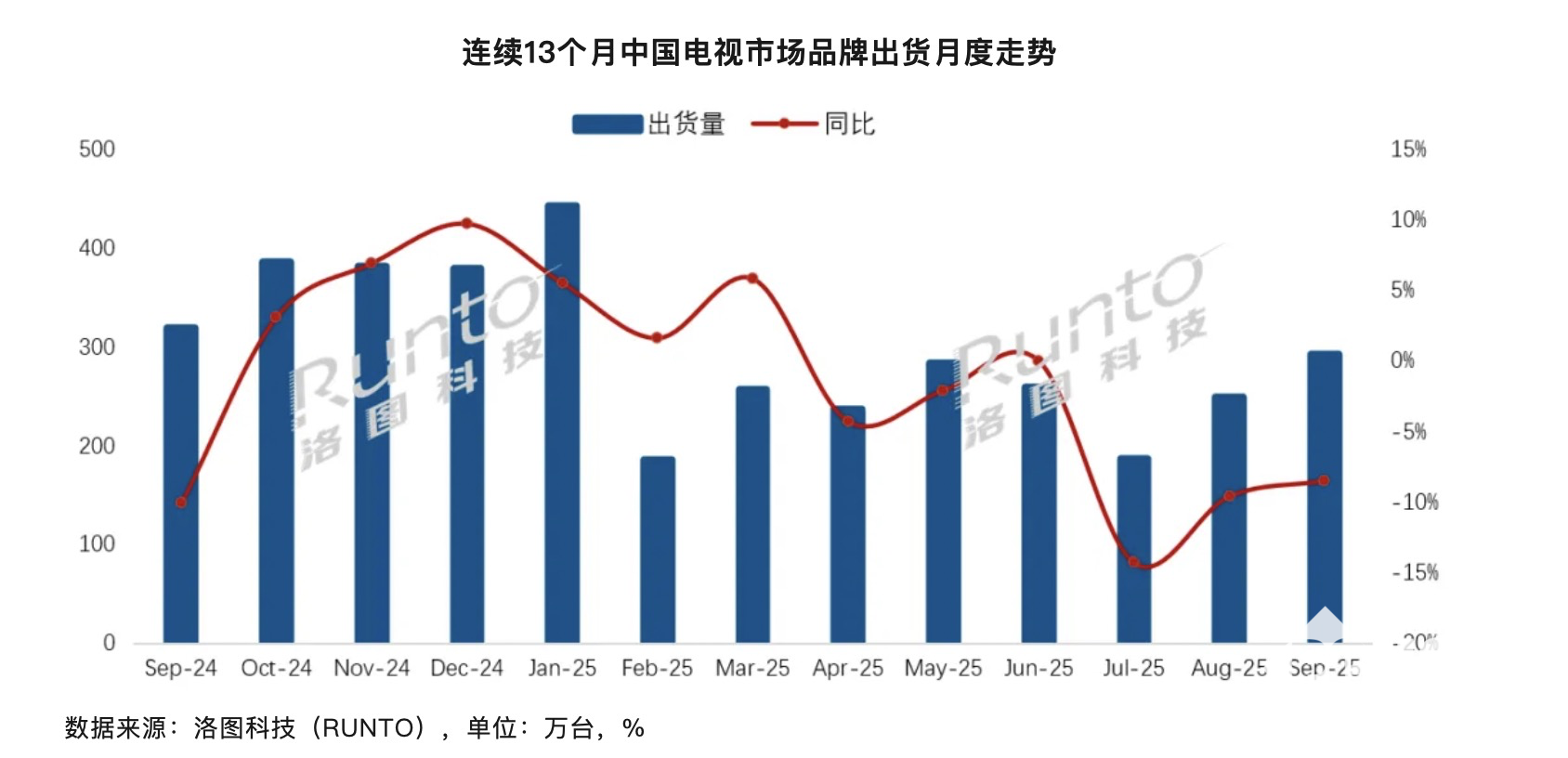 10月12号消息,根据洛图科技最新发布的《中国电视市场品牌出货月度快报》数据显示,2025年9月,中国电视市场品牌整机出货量为292.0万台,较去年同期下降8.5%,环比8月上涨17.3%。
