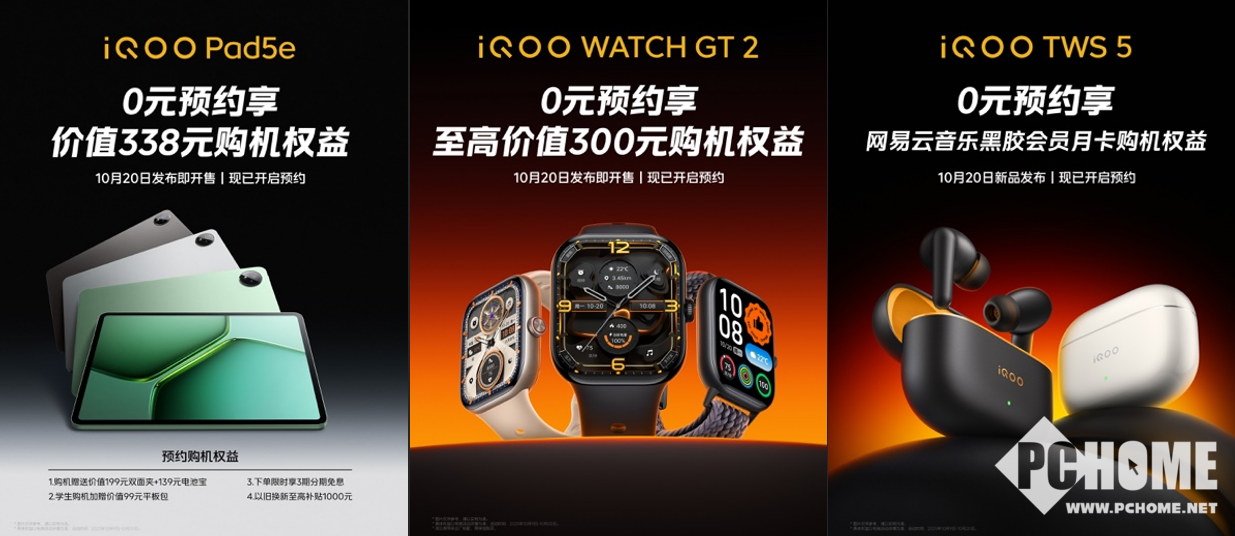 即日起,iQOO全家桶新品已在官方平台开启预约。iQOO Pad5e预约即享价值338元购机权益;iQOO WATCH GT 2预约可享至高价值300元购机权益;iQOO TWS 5预约可享网易云音乐黑胶会员月卡购机权益。10月20日,iQOO Pad5e和iQOO WATCH GT 2发布即开售,保证每一位玩家全装备进场,痛快玩把大的!