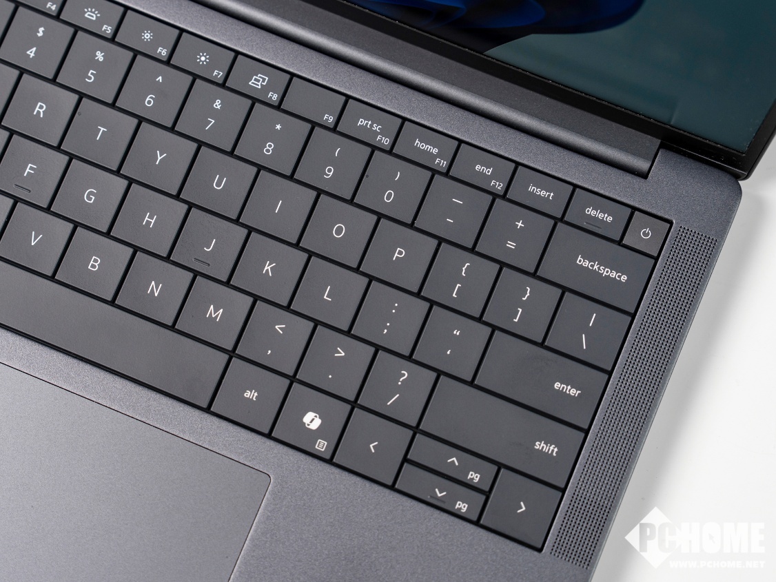 键盘方面,相信熟悉戴尔科技的朋友们看到Dell Pro 14 Premium会倍感亲切,无网格键盘再度现身。按键宽大,手感上佳。键程舒适,回弹清脆,打字体验还是非常舒适的。另外还配备了两级可调的白色背光灯,特别采用了mini LED电池节能背光技术,可将键盘的功耗减少多达75%,有助于延长电池续航时间。