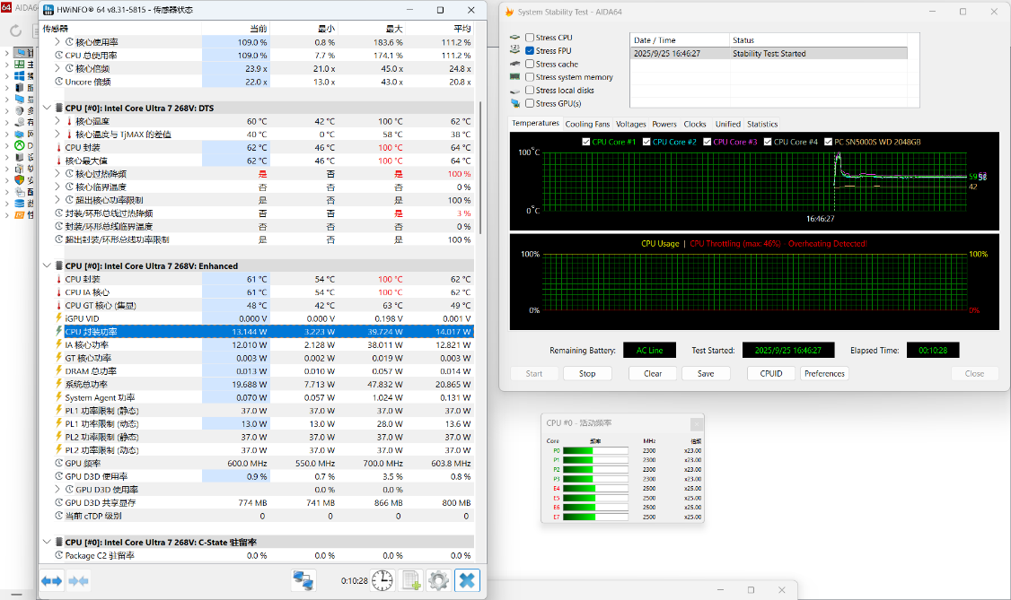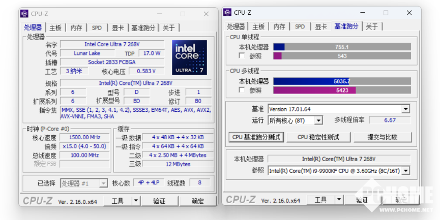 绝对性能方面,本机搭载的Ultra 7 268V处理器在CPU-Z的测试中,多线程得分达到5035分,已经接近于默认65瓦的第九代桌面酷睿i9处理器,能效比非常出色。