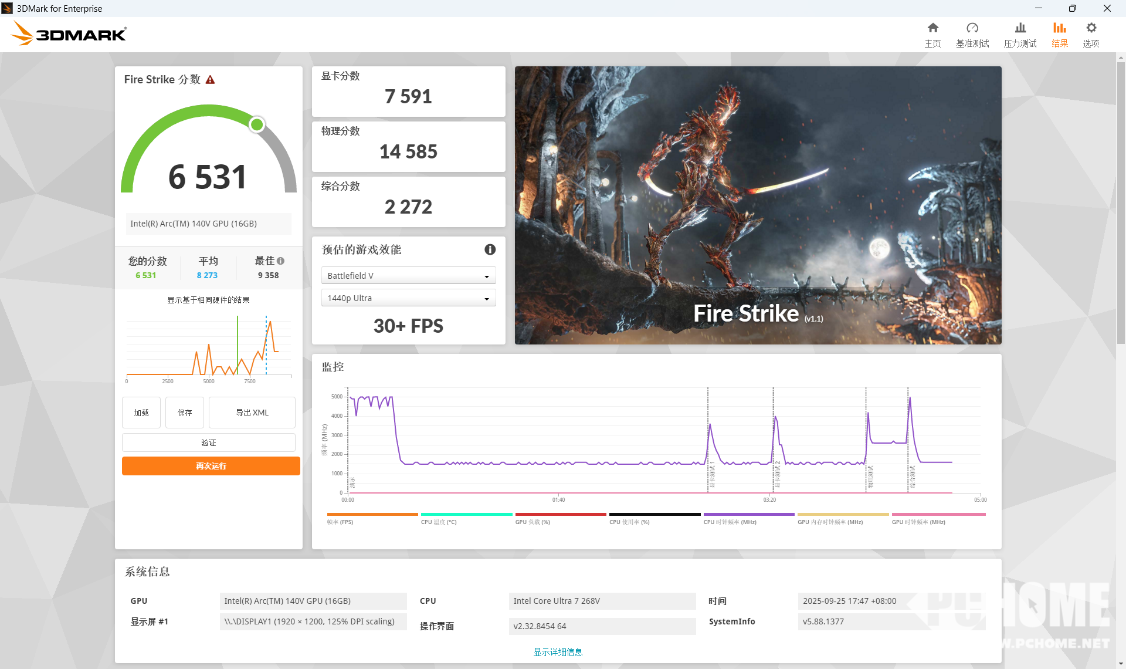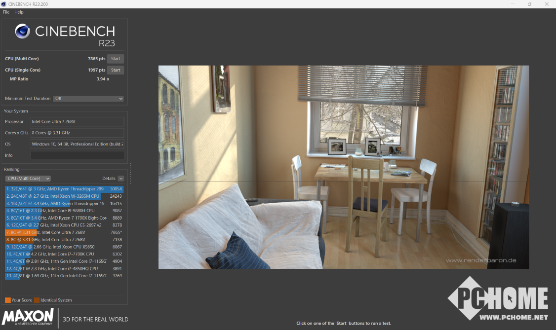 在CINEBENCH R23的测试中,Ultra 7 268V取得了单核1997 pts,相比酷睿Ultra 7 155U高出约9%左右。至于多核心性能,由于取消了超线程,总共8核心8线程的情况下,功耗释放略微保守了一点,成绩为7865 pts。