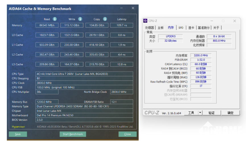 内存方面,由于酷睿Ultra 200V集成了MoP封装式内存,为板载32GB、LPDDR5X规格,频率达到8533MHz。在AIDA64 Cache&Memory Benchmark的测试中,内存读取、写入、复制速度分别为86543 MB/s、115.12 GB/s、104.85 GB/s,延迟109.7 ns,运行速度非常快,日常使用中响应更迅速,多任务切换不再卡顿。
