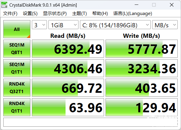 硬盘方面,本台Dell Pro 14 Premium测试机搭载了来自西数的NVMe PCIe 4.0固态硬盘,容量2 TB,在CrystalDiskMark的测试中,连续读写速度分别为6392.49 MB/s、5777.87 MB/s,4K随机读写速度分别为63.96 MB/s、129.94 MB/s,整体表现值得肯定,属于Gen4 SSD中的优秀水平,兼顾大容量和高速度,拷贝大量文件、运行大型程序都能减少等待时间。