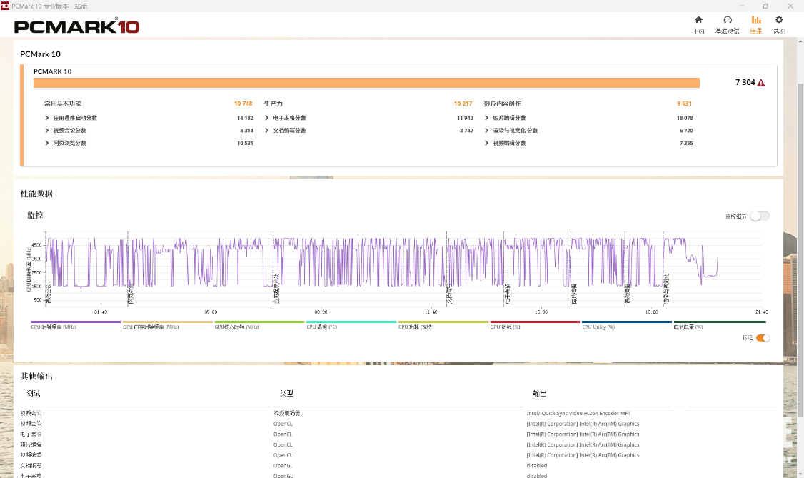 整机性能方面,Dell Pro 14 Premium在PCMark10的测试中,综合得分高达7304,已经是远超专业级笔记本的性能水平。其中常用基本功能得分10748分,生产力得分为10217,数位内容创作为9631,这意味着无论是日常办公,还是照片编辑、视频编辑等生产力创作,该机都能轻松HOLD住。