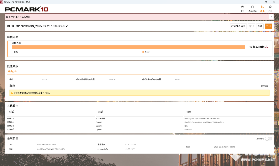 续航方面,Dell Pro 14 Premium虽然机身轻薄,但还是配备了60Wh容量的大电池,加上酷睿Ultra 200V出色的功耗控制,在PCMark10的现代办公电池续航测试中(Windows电源管理平衡,Wi Fi蓝牙开启,屏幕亮度40%),成绩惊人,高达17小时23分钟,这个成绩还是相当厉害的,应付移动办公是毫无压力,即使出门没带充电器也不用焦虑。