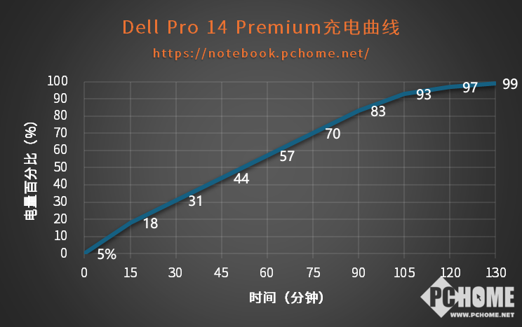 充电方面,Dell Pro 14 Premium标配两段式C口电源适配器,最高功率60瓦。充电曲线显示,充电速度非常线性,前90分钟内,每15分钟可以充进13%的电量,之后进入涓流充电,2小时内接近充满,是比较常规的充电速度。