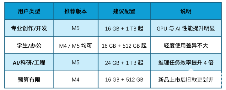 若你经常进行AI推理、机器学习、模型部署、多媒体渲染、视频处理、3D建模等专业工作,新款M5在GPU+Neural部件提升显著,而且未来的AI应用更倾向于利用这类加速单元,因此会带来更流畅的体验。并且,应该优先考虑更大存储/内存的配置:如果预算允许,建议至少选择1TB或更高容量SSD版本,以提高长远使用体验和残值。这里也可以根据你的需求参考一下配置:
