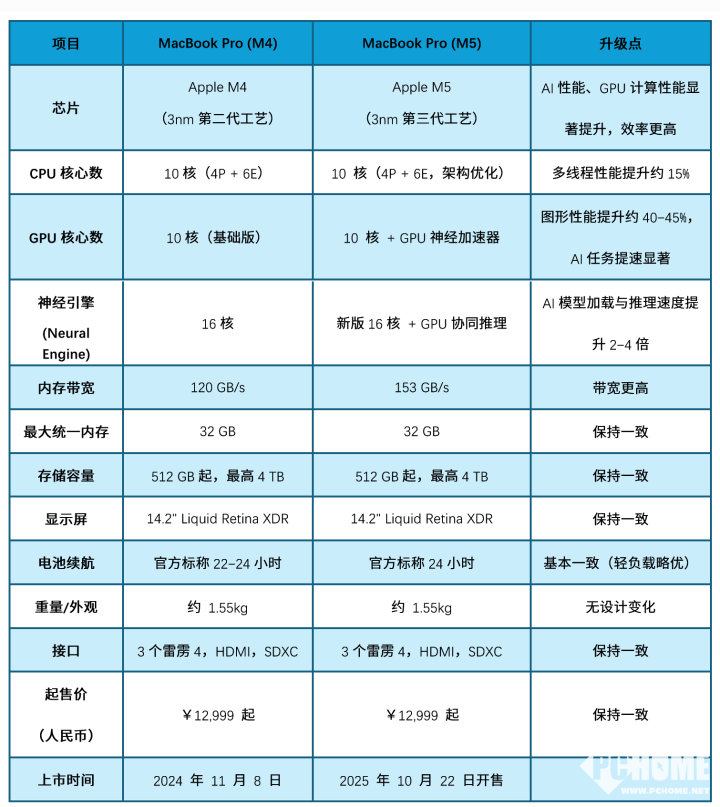 总的来说,这是一款以芯片升级为核心、在AI和图形性能上显著进步的MacBook Pro。具体的规格差异和价格信息可以参考以下表格: