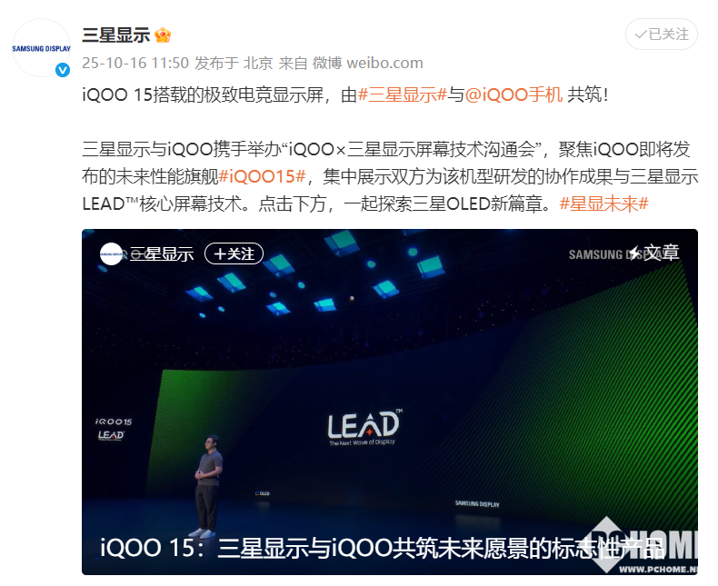 “自2019年起,iQOO与三星显示已达成六年深度协作,始终致力于为用户提供行业顶尖的显示体验。”副总裁李豪重表示,“此次发布的iQOO 15搭载2K三星珠峰屏,不仅集成三星显示尖端发光材料,更融入三星显示标志性的LEAD™技术,实现屏幕性能的全面突破。”