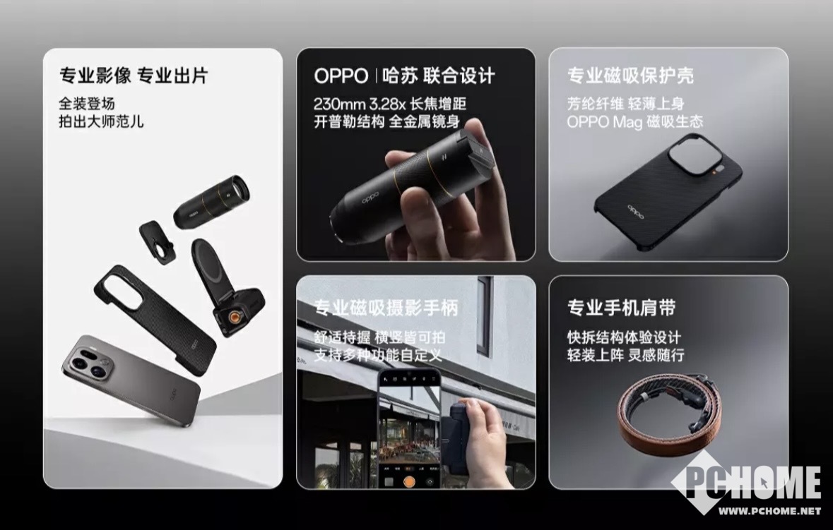 【哈苏专业影像套装】中包含了Find X9 Pro专用专业磁吸保护壳、镜头转接环、专业增距镜镜身以及增距镜前后保护盖、镜头衔接支架、磁吸摄影手柄、肩带。