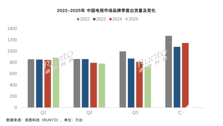 根据洛图科技最新发布的《中国电视市场品牌出货月度追踪》数据显示,2025年第三季度,中国电视市场品牌整机出货量为727.0万台,较去年同期下降10.4%,降幅较第二季度2.1%的水平进一步扩大;甚至环比第二季度也下降了6.6%,因此成为至少是近五年来唯一环比下滑的第三季度。
