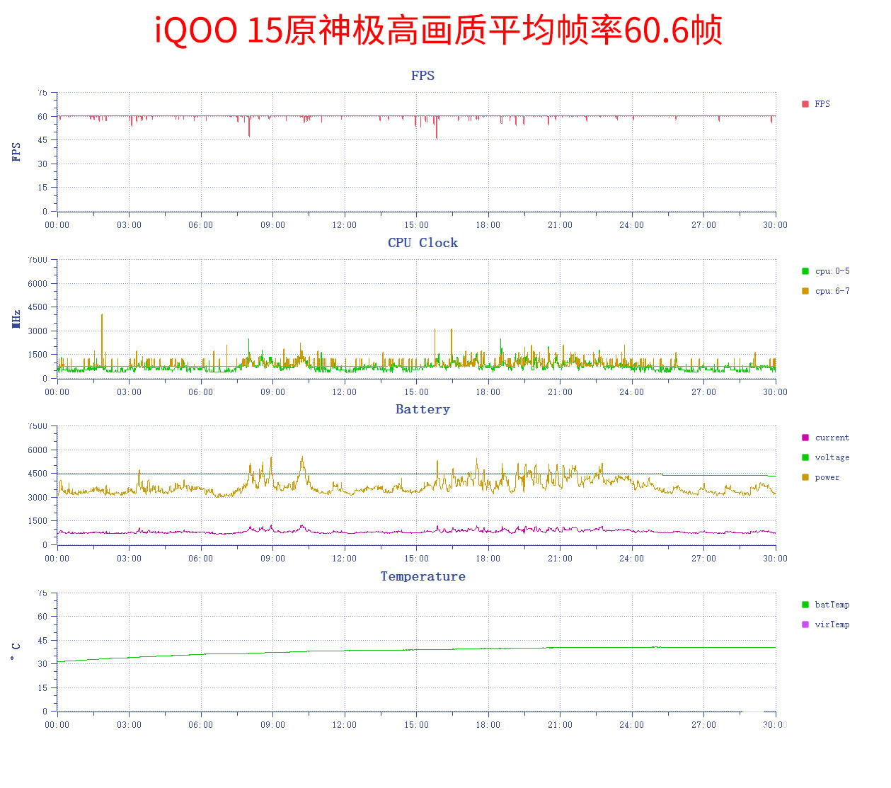 那么我们就直接来通过游戏,感受iQOO 15在性能方面的实力。在《原神》极高画质下,iQOO 15的平均帧率为60.6帧,一条直线的帧率曲线,也就说明了全程的流畅表现。对于当下的旗舰手机来说,《原神》在性能上没有什么实质性的压力,因此功耗方面会更为重要。iQOO 15平均功耗3.68W,妥妥的低功耗表现,发热量自然也就降下来了,正面38.7度,背面38.4度。