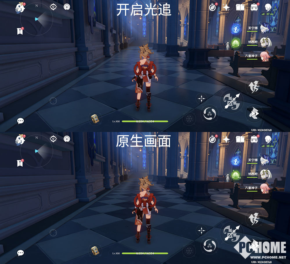 iQOO 15在《原神》中提供了自研光线追踪功能,该游戏并没有原生光追功能,在开启后的效果与默认画面有着天壤之别。光追场景中,从窗口透过的光线效果更显著,照射在柱子、长椅后,也有着更真实的阴影呈现,地面也会呈现出反光效果,整体画面更为真实。而原生画面就显得有些暗淡了。光追功能已经实现了《原神》的全场景覆盖,开启后能让我们感受到一个不一样的提瓦特大陆。